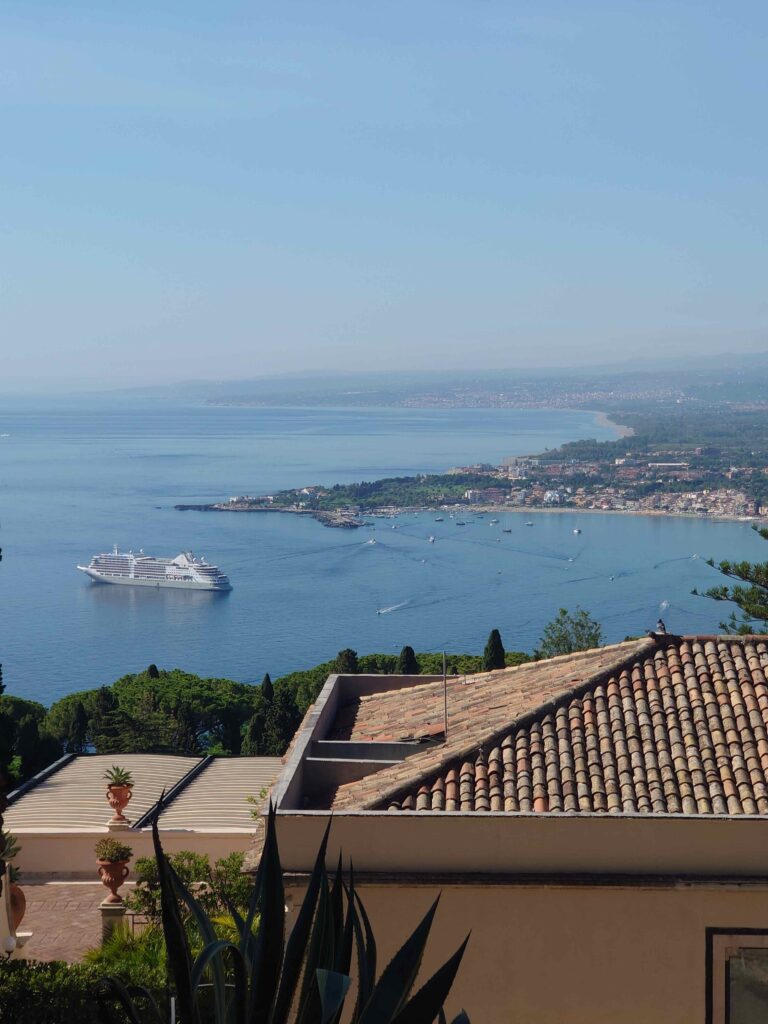 写真1はタオルミーナの丘の上(ギリシャ劇場がある)から見た湾内に浮かぶ豪華客船の係留の写真です。地中海クルーズの行き先としてシチリア島は大人気で、タオルミーナだけでなくカターニャやパレルモ、シラクーザなどシチリア島各地に豪華客船の寄港地があって、当然ですが寄港した数日はとてつもない混雑に陥ります。ここタオルミーナのように水深の浅い寄港地では沖なかに停泊し、テンダーボートと呼ばれる小型ボートで着岸上陸します。
