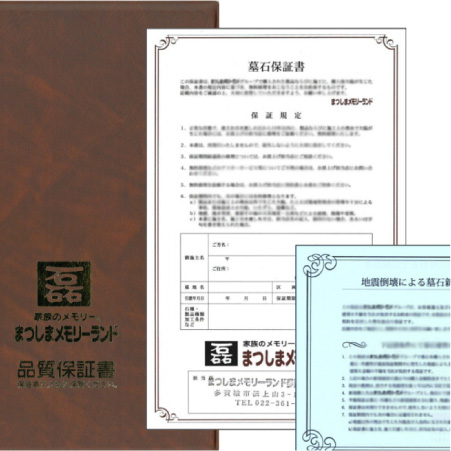 ② 地震建替え半額保証: 地震により墓石が倒壊してしまった場合、新しくお墓を建てる際の費用を当社が半額負担いたします。諸条件につきましては、店頭にて詳しくご説明させていただきます。