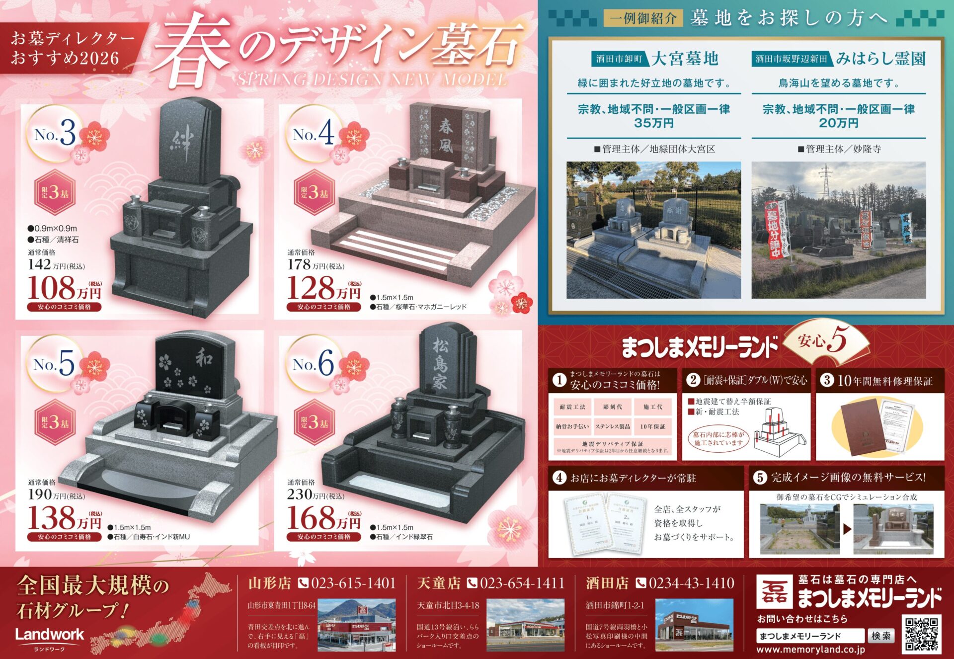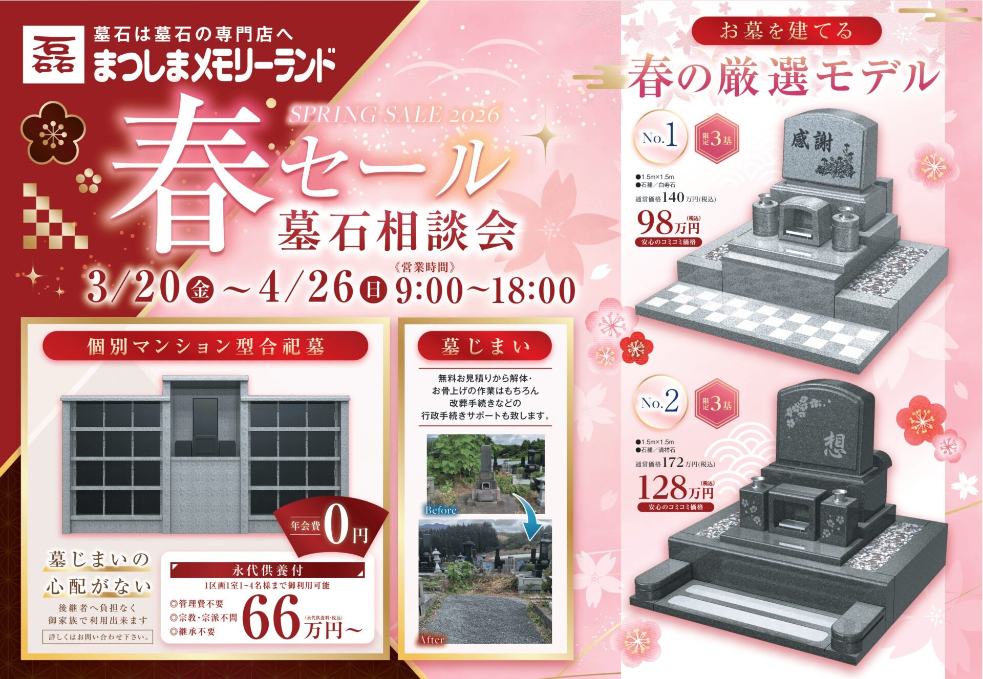 お墓のことでお悩みでしたら、山形県内で最大級の実績を持つ「まつしまメモリーランド」が贈る「春のセール、墓石相談会」へ。