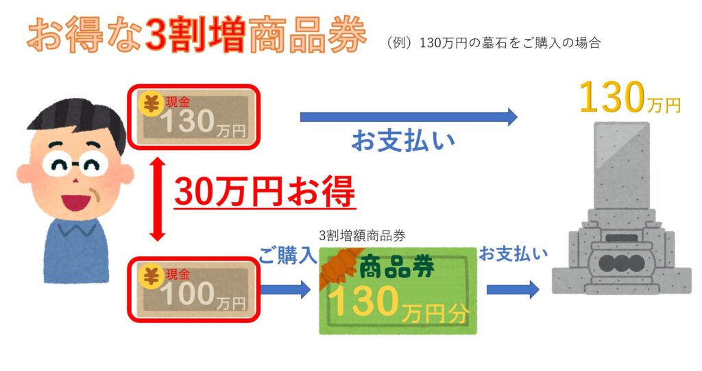 3割増商品券とは、地域のプレミアム商品券と同じようにお出しいただいた金額の30%増の商品券をお渡ししまして、墓石のお支払いに使用できる商品券です。