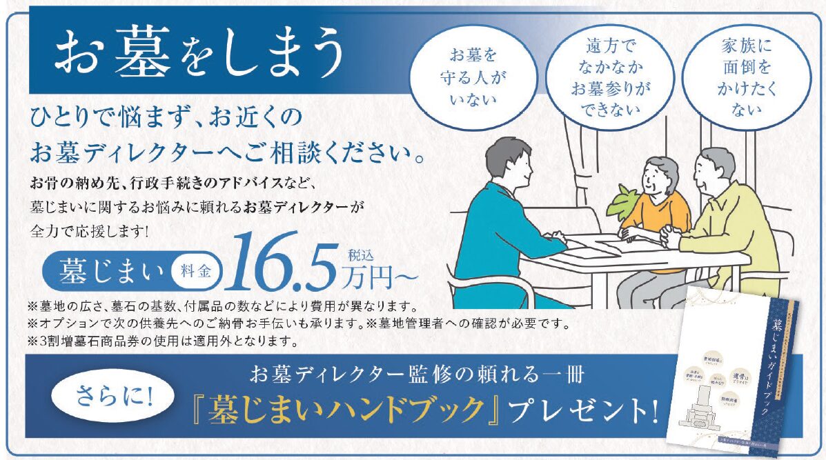 期間中は、経験豊富なお墓ディレクターが墓じまいやリフォームに必要な手続きや施工方法をわかりやすくご案内します。安心してご相談ください。