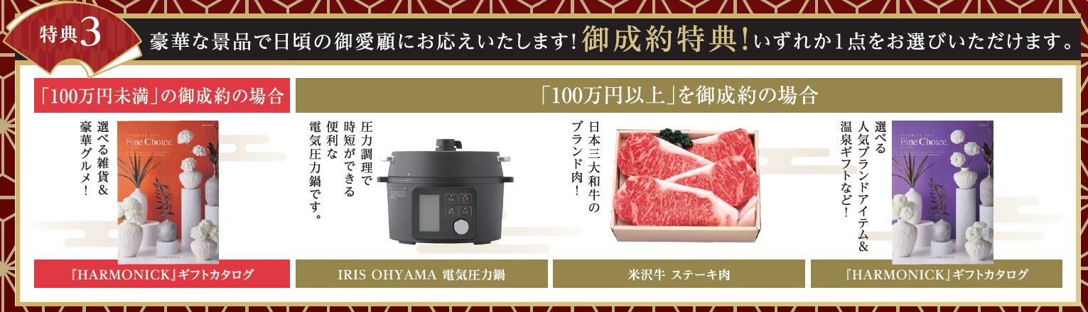 電気圧力釜 or 米沢牛ステーキ or ギフトカタログ、のいずれかをプレゼント!〇【 100万円未満 】をご成約の方