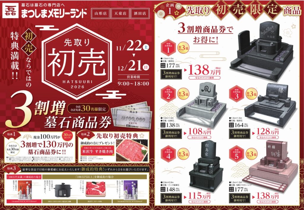 〇12/21(日)までの期間限定で、かつ【全店先着100件限定】にて3割増商品券を先行販売いたします。お墓の購入、建替えをご検討の方は、この機会をお見逃しないようにお願いします。