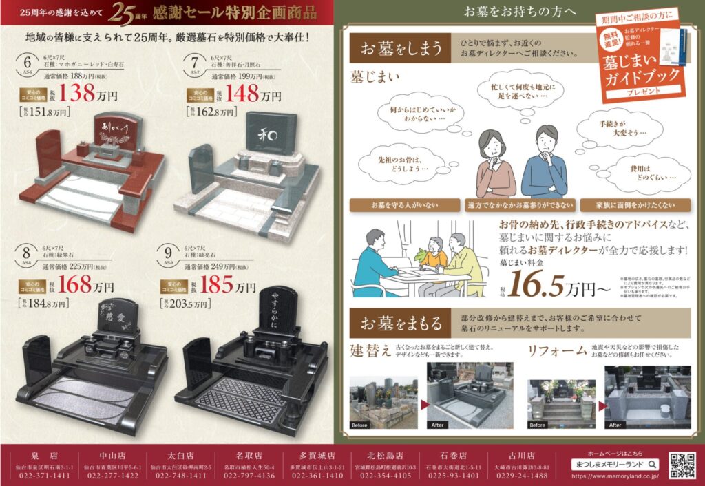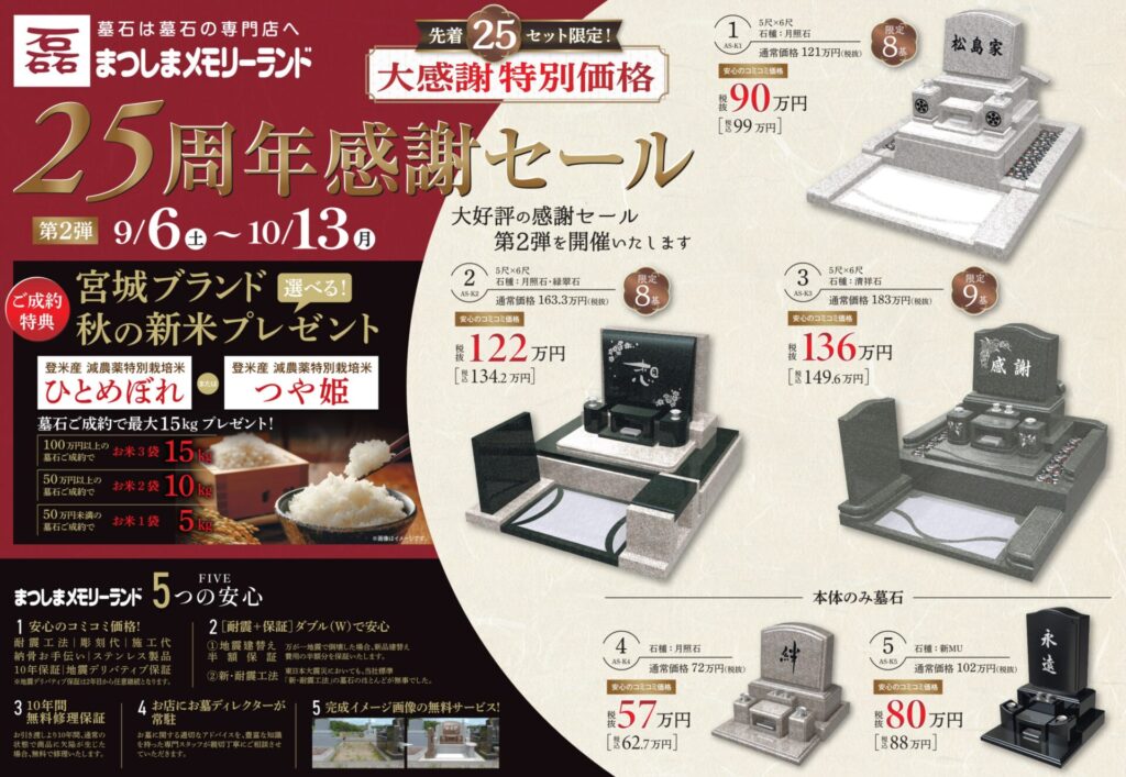 【宮城限定】25周年感謝セール|9/6~10/13 墓石セット&芝墓石を特別価格でご案内