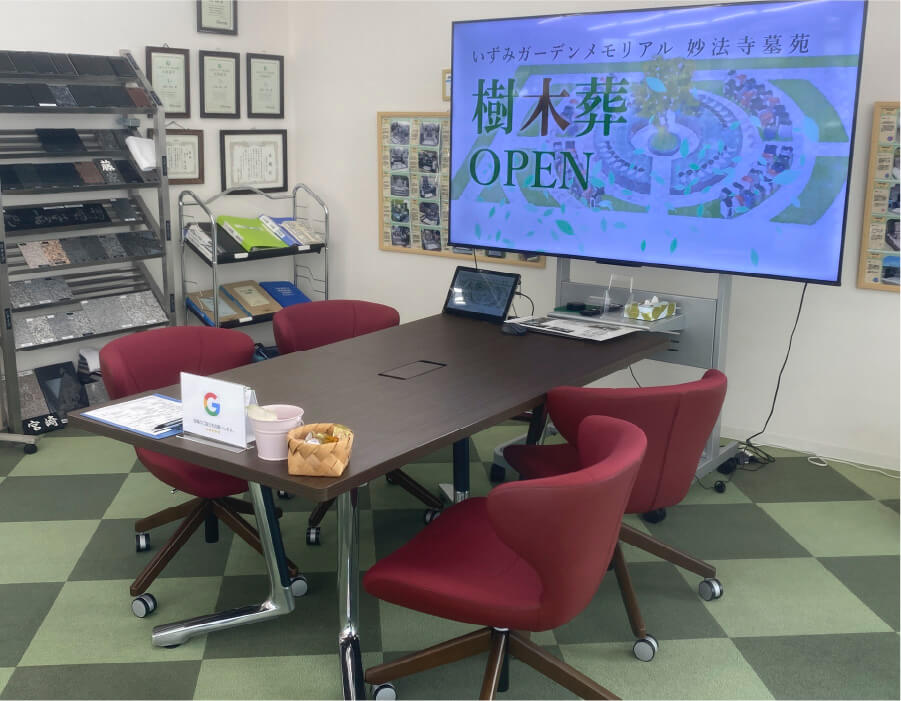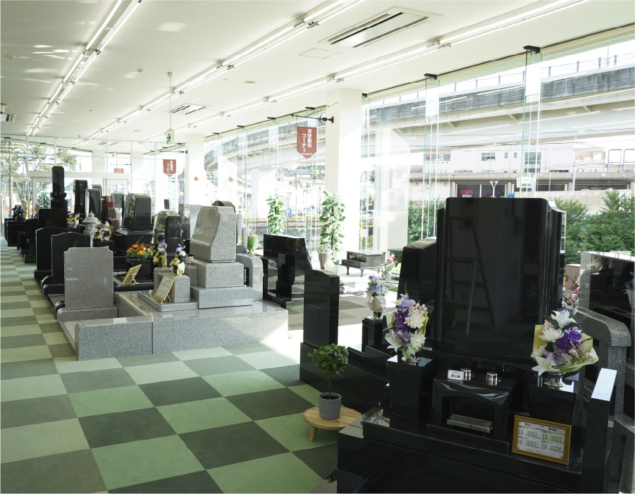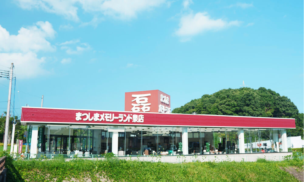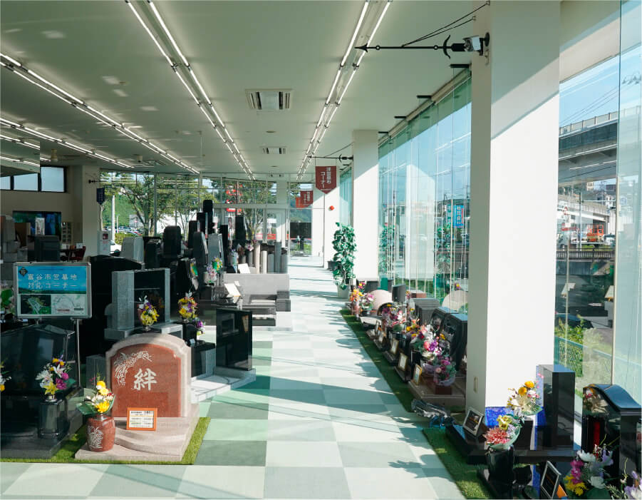 まつしまメモリーランド1号店として2000年にオープンした泉店は、地域初のショールームスタイルで、多くのお客様にご支持いただいてまいりました。広々とした店内には、伝統的な和型から人気の洋型まで、多彩な墓石をゆったりと展示。お客様が天候を気にせず、心ゆくまでお選びいただける空間です。2023年には店舗のリフォームを行い、より快適な空間で最新の墓石をご提案しています。