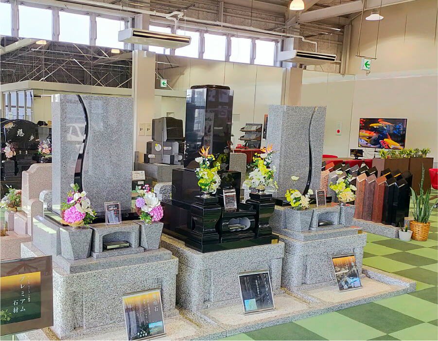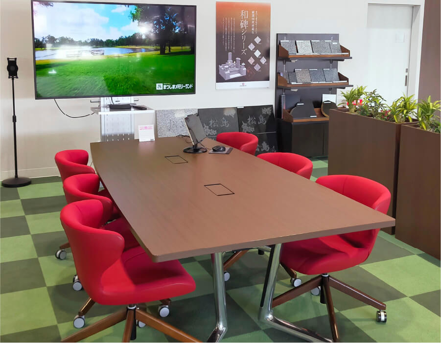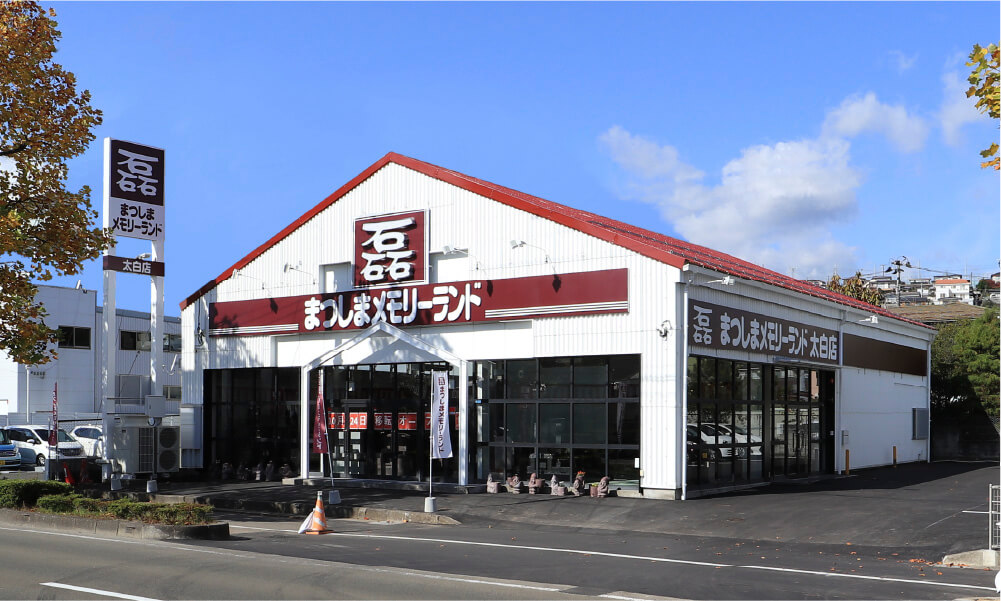 2020年10月、長町南店が移転リニューアルし、太白店としてオープンいたしました。店内には65インチの大型モニターや、夜間にはウインドウスクリーンを活用したデジタルサイネージを導入。最新の設備を整えたショールームで、墓石に関するご相談はもちろん、お墓の建立やリフォーム、墓じまいなど、お墓にまつわる様々なご質問に幅広くサポートさせていただきます。どうぞお気軽にお立ち寄りください。